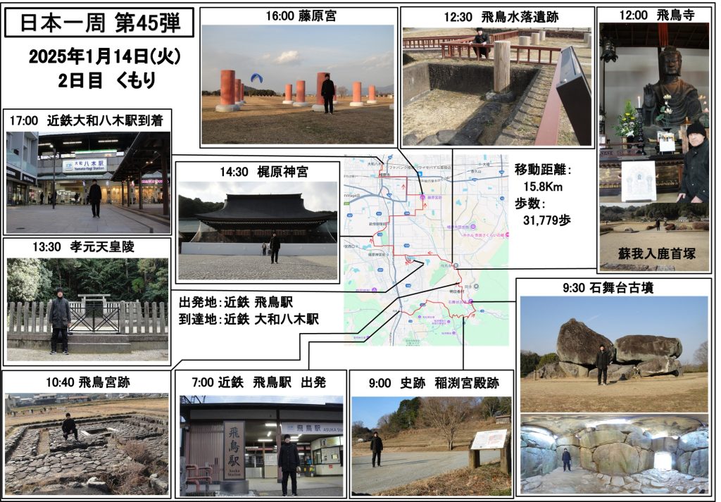飛鳥地方に入り、昨日は4つの古墳を訪れ、近鉄飛鳥駅で終わりにした。今日はその飛鳥駅から出発し、最初に訪れたのが石舞台古墳である。朝9時を過ぎた時間であり、誰も訪れている人はいない。大型クレーンでも吊り上げることは容易ではないほどの大きな石が数個、ガッチリと積まれて古墳が作られている。その石の下には広い石室があり、横の入口から入ることができる。中で何枚か写真に映ったが、やはり外から全体と一緒に映る方が特徴を最も伝えることのできる写真であると思う。太陽の光も、ちょうど良い方向から射してきており、雲のない青空と調和してきれいな写真が撮れた。この古墳の造り方を説明した掲示板があったが、大勢の人が永い年月をかけて造ったのだろうな、と千数百年前を想像してみた。